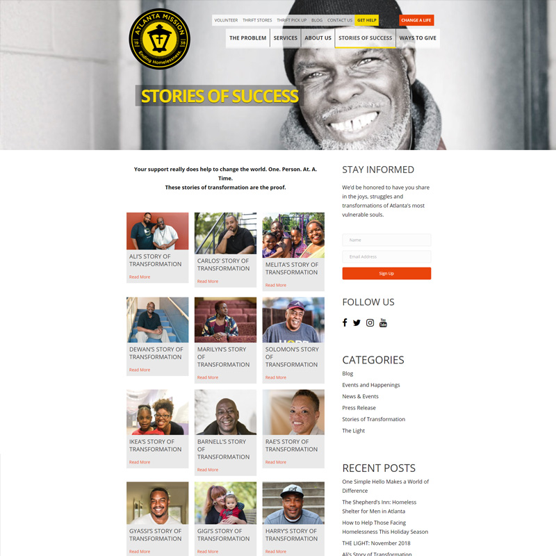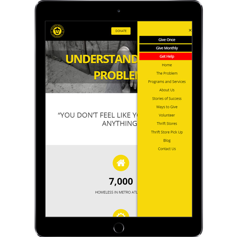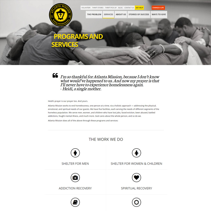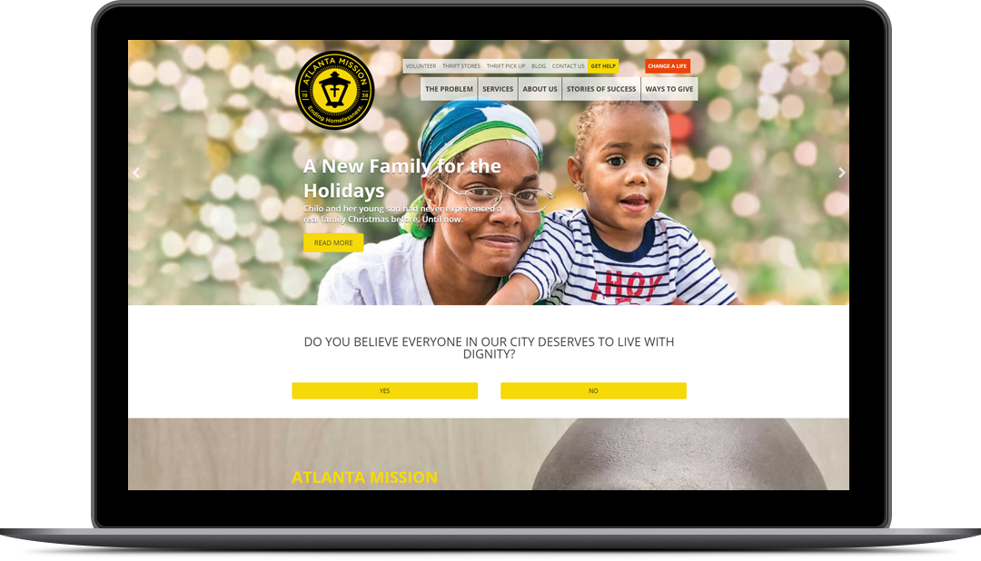 Atlanta Mission had recently re-branded themselves and were looking for a website to reflect their new identity. They were also looking to help solve a few issues, as their active donor base was shrinking, and they weren’t retaining donors. They wanted the new website to go along with a multi-channel push that included email campaigns, social media, and direct mail.